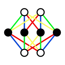 In supergravity and supersymmetric representation theory, Adinkra symbols are a graphical representation of supersymmetric algebras.[1][2][3][4][5] Mathematically they can be described as colored finite connected simple graphs, that are bipartite and n-regular.[6] Their name is derived from Adinkra symbols of the same name, and they were introduced by Michael Faux and Sylvester James Gates in 2004.[1]