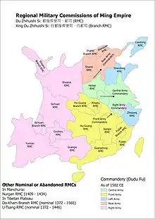Under Ming administration, the jurisdictional authority of tusi began to be replaced with state territorial authority. The tusi acted as stop gaps until enough Chinese settlers arrived for a "tipping point" to be reached, and they were then converted into official prefectures and counties to be fully annexed into the central bureaucratic system of the Ming dynasty. This process was known as gaitu guiliu (simplified Chinese: 改土归流; traditional Chinese: 改土歸流), or "turning native rule into regular administration".[43] The most notable example of this was the consolidation of southwestern tusi chiefdoms into the province of Guizhou in 1413.[43]