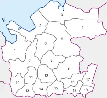 On June 9 [O.S. May 29], 1719, the governorate was divided into provinces: Archangelgorod, Vologda, Galich, and Ustyug.[6] Simultaneously, Yarensky Uyezd with the administrative center of Yarensk was moved from Siberia Governorate to Archangelgorod Governorate.[7] The uyezds were transformed into districts, however, in 1727 the districts were transformed back into uyezds. On February 5 [O.S. January 25], 1780, Archangelgorod Governorate was transformed into Vologda Viceroyalty.[6] In 1796, the viceroyalty was split into Arkhangelsk and Vologda Governorates, the latter one including the areas currently in the south-east of the Oblast. In 1918, these areas were split off from the Vologda Governorate and moved to the newly established Northern Dvina Governorate. The administrative center of the governorate was Veliky Ustyug.