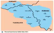The central and upper Vistula valley within the General Government were variously discussed as having to become either a single Vandalengau (Gau of the Vandals) or 3-5 other new Reichsgaue.[18] An earlier proposal from 1939 also advocated for the creation of a Reichsgau Beskidenland, which was to stretch from the area to the west of Cracow to the San river in the east.[19] In Axis-occupied Yugoslavia, Sepp Janko, Nazi representative of Danube Swabian interests, pushed for the establishment of a Reichsgau Banat or Prinz-Eugen-Gau, which would have encompassed the Yugoslavian territories of Bačka, Banat, parts of Transylvania (Siebenbürgen) and Baranya.[20]