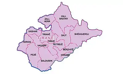 Following the 2015 Administrative-Territorial Division Reform, 13 new rural administrative units were added to the new Municipality of Tirana. The new divisions and their corresponding villages are as follows:[3]