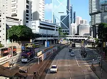 Queensway and Harcourt Road are the major roads in the area. Both roads run from west to east and connect Central to Wan Chai. Other streets include Rodney Street and Tim Mei Avenue. Trams are running across Admiralty along Queensway. Most of the buildings of the area are connected through the Central Elevated Walkway, an extensive footbridge network which extends to the western part of Central.