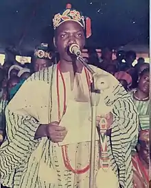 Charles Oladele Akande Ibitoye, was the thirty third traditional ruler (king) or Olomu of Omu-Aran from 1993 until his death in the year 2017. He was born into the Ruling House of Ijawusi of Ikoja Compound (28 October, 1953 - 30 November, 2017).[1] He took the regnal name Adogbajale-bi-ileke II.[2] Omu-Aran, which is the Head Post of Igbomina land, a town in the Nigerian state of Kwara. It originated from Ile-Ife and is the local government headquarters of the Irepodun local government.[3] He was crowned on 19 February 1993 and was presented a first class Staff of Office on the 8 May 1993 by His Excellency Mohammed Sha'aba Lafiagi, Executive Governor of Kwara State, in a ceremony attended by dignitaries from across the globe.[4]