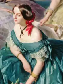 She belongs to the ladies-in-waiting depicted with Eugenie in the famous painting Empress Eugénie Surrounded by her Ladies in Waiting by Franz Xaver Winterhalter from 1855.