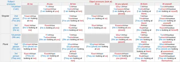 | Inside | и~ [jə~] | еплъэ [japɬa] "(s)he is looking inside" | редзэ [rajd͡za] "(s)he is throwing inside" |