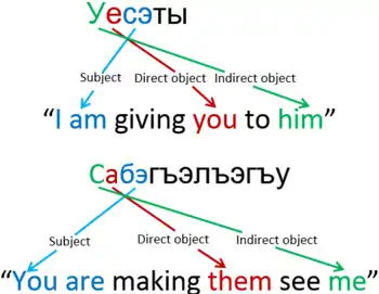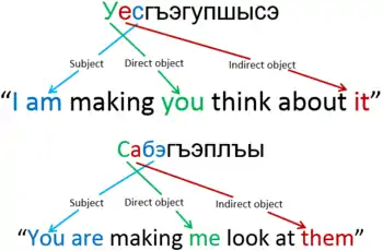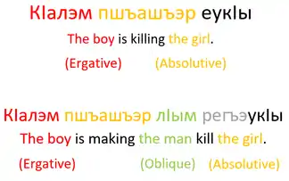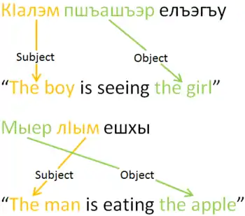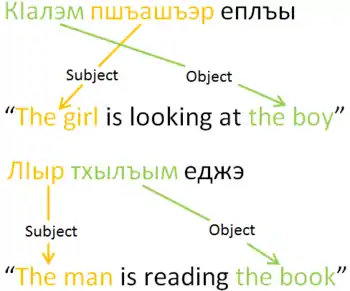 кӏалэр пшъашъэм еплъа е кӏалэм пшъашъэр къеплъа? кӏалэ-р пшъашъэ-м еплъ-а е кӏалэ-м пшъашъэ-р къ-еплъ-а? [t͡ʃʼaːɮar pʂaːʂam japɬaː ja t͡ʃʼaːɮam pʂaːʂar qajpɬaː] boy (abs.) girl (erg.) is (s)he looking at it? or boy (erg.) girl (abs.) is (s)he looking at it? "Is the boy looking at the girl or is the girl looking at the boy?"
