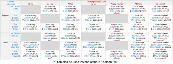 | Plural | First-person | ткӏуагъ, теджагъ | tkʷʼaːʁ, tajd͡ʒaːʁ | We went, We [have] read |