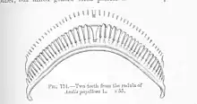 Unlike other Aeolidida, the family Aeolidiidae possesses radular teeth which aid in feeding on their prey (See Fig. 2).[7] The radula is a feature in majority of mollusks located in the mouth, like a tongue, containing thousands of teeth that help cut up food for digestion by scraping against rocks or even