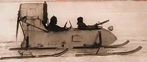During World War II aerosani were used for reconnaissance, communication, and light raiding in northern areas thanks to their high mobility in deep snow (25–35 km/h, where many vehicles could not move at all).[3] Responsibility for aerosani was transferred to the Soviet Armoured Forces (GABTU) and orders were submitted for design and fabrication of lightly armoured versions, protected by ten millimetres of steel plate on the front. They were organized into transport or combat battalions of 45 vehicles, in three companies, often employed in cooperation with ski infantry. Troops were usually carried or towed by transport aerosani, while fire support was provided by the heavier machine gun-armed, armoured models. aerosani were not used for direct assault because of their vulnerability to explosives such as mortar rounds.
