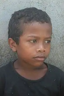 The Aeta (Ayta /ˈaɪtə/ EYE-tə), Agta, or Dumagat, are collective terms for several Filipino indigenous peoples who live in various parts of the island of Luzon in the Philippines. They are considered to be part of the Negrito ethnic groups and share common physical characteristics of dark skin tones, short statures, curly to Afro-textured hair, and a higher frequency of naturally lighter hair colour (blondism) relative to the general population. They are thought to be among the earliest inhabitants of the Philippines, preceding the Austronesian migrations.[2][3] Regardless, modern Aeta populations have significant Austronesian admixture and speak Austronesian languages.[4]