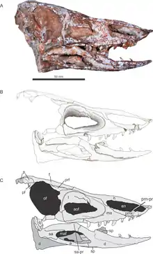 Aetosauroides was proposed to be synonymous with the genus Stagonolepis in 1996 and 2002.[4][5] Smaller specimens of both species were placed with Stagonolepis robertsoni, and larger specimens were considered to be S. wellesi. This synonymy is not accepted,[1][6][7][8] with several studies identifying unique features that distinguish Aetosauroides from Stagonolepis. Among these are maxillae that do not touch the nostrils, oval-shaped holes on the centra of the vertebrae, and a convex margin of the lower jaw. In a 2011 study, A. subsulcatus and A. inhamandensis were proposed to be synonymous with A. scagliai.[8] Additionally, a contemporary aetosaur named from a juvenile specimen in 2014, Polesinesuchus aurelioi, was found to be similar in its vertebrae and the basioccipital of its braincase to juvenile specimens of Aetosauroides in two 2021 studies, and it was proposed as a junior synonym of the latter.[2][9]
