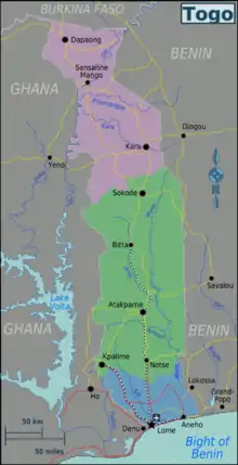 A small French force invaded Togoland from north-west French Dahomey on 9 August and four days later met and skirmished with the German defenders in the districts of Sansane-Mangu and Skode-Balfilo; the French company retreated after finding German resistance greater than expected.[10] More detachments followed, c. 200 Togolese troops in the area deserted, many of the rest retreated and the local civilian authorities hurried to repudiate German allegiance. M. Duranthon advanced from Fada Ngurma with about 140 police and volunteers, was followed by M. Arboussier with a force of c. 120 volunteers and police from Ouagadougou and Captitaine Bouchez with about 130 soldiers of the 2nd Tirailleurs Sénégalais. Arbroussier reached Sansane Mangu on 23 August and Bouchez on 26 August, having covered 372 mi (599 km) in twenty days. A British column of 104 men from Gambaga arrived at Sansane Mangu on 18 August and c. 400 French police and volunteers occupied other places in northern Togoland, having crossed difficult country, little known to the colonial occupiers.[11]