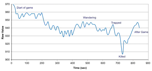 Here we can see a plot of skin resistance measured using GSR and time whilst the subject played a video game. There are several peaks that are clear in the graph, which suggests that GSR is a good method of differentiating between an aroused and a non-aroused state. For example, at the start of the game where there is usually not much exciting game play, there is a high level of resistance recorded, which suggests a low level of conductivity and therefore less arousal. This is in clear contrast with the sudden trough where the player is killed as one is usually very stressed and tense as their character is killed in the game