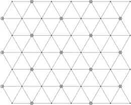 The fixed subspaces of these reflections divide V into congruent simplices, called alcoves.[6] The situation when is shown in the figure; in this case, the root lattice is a triangular lattice, with reflecting lines dividing it into equilateral triangle alcoves. However for higher dimensions, the alcoves are not regular simplices.
