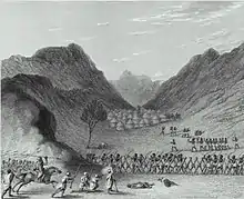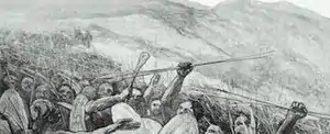 When the whole record is analyzed, gun-armed European troops met defeat on several occasion by charging spearmen or African infantry using poisoned arrows.[59] In 1684 for example, the spearmen and bowmen of Changamire Dombo met the Portuguese in open combat at Mahungwe. Firearms inflicted heavy casualties on the African force, but the prolonged battle stretched into the darkness and night attacks forced a Portuguese retreat, after which their camp was looted. Portuguese writers of the period comment favorably on the tight discipline of the African armies, additional weapons such as battle axes, the crescent formation used as they deployed for battle, and deception tactics during night attacks that included erecting a massive number of campfires around the Portuguese position, fooling defenders into thinking Dombo's force was twice as large.[60] In the 1690s Dombo's forces followed up this victory with a clean sweep of the Portuguese, in a campaign that expelled them from all their settlements on the Zimbabwe plateau. This triumph effectively terminated the future presence of the Portuguese in the area, cutting them off from the gold mines. Overall, Portugal's foothold in the region was to remain tenuous for at least two centuries.[57] These and other incidents illustrate both the power and limitations of firearms in African military systems. The later observations of Zulu King Chaka on the efficacy of firearms versus African alternatives were thus not unreasonable. It should be noted however that several of the Angolan kingdoms integrated a mix of gunmen with their indigenous fighting forces, adding to the diversity of arrangements for combat.[59] This integration of new technology with existing systems is similar to the pike-musket-crossbow combinations seen when firearms were introduced to European battlefields.[58]