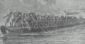 Formations were comparatively loose in the Congo region, and various groups were tasked with movements determined on the spot by their leaders. Firearms did not change this basic pattern. While movement was not as tightly controlled or executed as among the Zulu, war-leaders were quite aware of the basic stratagems of maneuver, including extension of a battle-line to attempt encirclement.[72] In the Guinea/Gambia Zone however fighting formations were tighter, an expedient also adopted by European infantry who faced mounted knights. According to sailors of the repulsed Hawkins expedition in the 16th century, armies deployed with shield-bearers in front, each with a two-headed javelin for fighting. Behind each shield-bearer, stood 3 archers, ready to provide firepower support. The battle usually opened with a discharge of arrows. A war cry was then given, and general hand-to-hand fighting ensued. Tighter formations required planned drill in advance. A commander named Xerebogo for example in the 16th century kept his soldiers in step by using bells attached to pace horses. The advent of guns loosened this tight organization, and more maneuver and open formations were employed.[74]