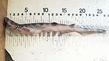 Small bony fishes, including lanternfishes, hakes, grenadiers, rockfishes and lightfishes, comprise the bulk of the African sawtail catshark's diet. Squid and crustaceans may also be consumed.[3] A known predator of this species is the southern African frilled shark (Chlamydoselachus africana).[6] Unlike other members of its genus, the African sawtail catshark is aplacental viviparous, with females retaining eggs internally until they hatch. There is apparently no defined breeding season, and mating and birthing occur throughout the year. Adult females have two functional uteruses and produce litters of up to 12 young; litter size increases with female size. The developing embryos are initially sustained an external yolk sac, and emerge from the egg at between 2.4 and 2.8 cm (0.94 and 1.10 in) long. Pigmentation begins to develop at an embryonic length of 5 cm (2.0 in). At around 6 cm (2.4 in) long, the embryos have well-developed external gills, which largely disappear by the time they are 10 cm (3.9 in) long. Near-term fetuses weigh over twice as much as eggs, suggesting some form of secondary maternal provisioning during gestation.[2][7] The newborns measure 10–18 cm (3.9–7.1 in) long. Males and females reach sexual maturity at 30–46 cm (12–18 in) and 30–43 cm (12–17 in) long respectively.[1][4]