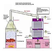Oud oil can be distilled from agar wood using steam; the total yield of oil for 70 kg of wood will not exceed 20 ml.[34]