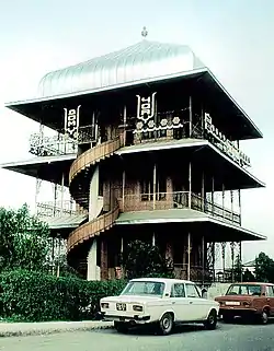 The tea house was based on the idea of the academician Khudu Mammadov during Sadig Murtuzayev's post as first Secretary of the Agdam District Party Committee of the Central Committee of the Azerbaijan SSR. Naik Samadov was chief architect of the Tea House project. In the project, masonry was only used on the first floor. The remainder consisted of metal construction. It was decided to place the tea house near the mosque after discussion with Khudu Mammadov. Penal labor was used to reduce construction costs.[1] The tea house was inaugurated on 26 July 1986. In addition to the regional officials, Vafa Guluzade, the head of the Culture Department of the CP CC of Azerbaijan SSR, also participated in the opening ceremony.[1] The article published in the July 31, 1986, issue of "The Lenin Path", on the occasion of the opening of the tea house, reads: