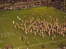 During a game, the Yell Leaders signal the crowd to start a yell by flashing pass backs.[7] Once the signal is passed throughout the crowd, the Yell Leaders give the signal for the crowd to "hump it," or lean forward with hands just above their knees, and the yell begins. The theory behind "humpin' it" is that it aligns the back, neck and throat in the proper position to maximize the noise.[9] They also use pass backs to signal when to sing the various school songs, in much the same way as cheerleaders lead songs at other schools.[9]