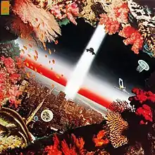 The front cover depicted an advanced civilization with a vast landscape of skyscrapers and red, sunburst-like flames rising out of the cityscape as representations of Agharta's power.[64] Yokoo used a combination of collage, airbrushing, and painting techniques as he had with his previous work, along with postcards collected from his trips to Tahiti and New York City; the cityscape on the front cover was taken from one of his postcards.[60] The back cover showed the city submerged in water, embedded in coral reefs, and hovered over by a diver, fish, and a squid ascending from the city.[62] According to graphic designers Storm Thorgerson and Aubrey Powell, Yokoo depicted groups of jellyfish, coral reefs, and brightly colored fish to suggest an association between Agharta and Atlantis.[61] The foreground of the back cover's illustration featured a reptilian creature. Cultural studies researcher Dagmar Buchwald interpreted this image as an allusion to similar ideas about Lemuria; this mythological continent supposedly existed during Earth's prehistory and was inhabited by an advanced civilization, later forced under the Earth's surface after its homeland was destroyed by a great flood.[62]
