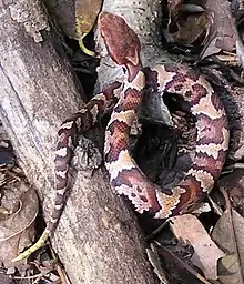 Juvenile and subadult specimens generally have a more contrasting color pattern, with dark crossbands on a lighter ground color. The ground color is then tan, brown, or reddish brown. The tip of the tail is usually yellowish, becoming greenish yellow or greenish in subadults, and then black in adults. On some juveniles, the banding pattern can also be seen on the tail.[19] Young snakes wiggle the tips of their tails to lure prey animals.[23]