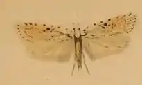 The wingspan is 19–23 mm.The forewings are whitish ochreous,more or less suffused with fuscous and sprinkled with dark fuscous ; costa spotted with dark fuscous ; first discal stigma and a dot obliquely before and above it black ; second indistinct, dark fuscous ; a dark fuscous spot between and above these ; dark fuscous terminal dots. Hindwings are pale whitish-fuscous.The larva is green, paler laterally ; dorsal and subdorsal lines dark green ; dots blackish ; head light brownish-ochreous ; 2 with two blackish spots.[1]