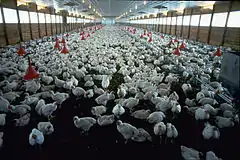 Livestock production systems can be defined based on feed source, as grassland-based, mixed, and landless.[125] As of 2010, 30% of Earth's ice- and water-free area was used for producing livestock, with the sector employing approximately 1.3 billion people. Between the 1960s and the 2000s, there was a significant increase in livestock production, both by numbers and by carcass weight, especially among beef, pigs and chickens, the latter of which had production increased by almost a factor of 10. Non-meat animals, such as milk cows and egg-producing chickens, also showed significant production increases. Global cattle, sheep and goat populations are expected to continue to increase sharply through 2050.[126] Aquaculture or fish farming, the production of fish for human consumption in confined operations, is one of the fastest growing sectors of food production, growing at an average of 9% a year between 1975 and 2007.[127]