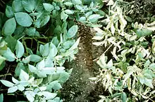 Genetically modified potato plants (left) resist virus diseases that damage unmodified plants (right).
