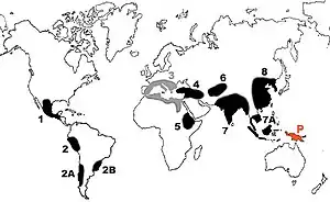 Centres of origin, as numbered by Nikolai Vavilov in the 1930s. Area 3 (gray) is no longer recognised as a centre of origin, and New Guinea (area P, orange) was identified more recently.[10][11]