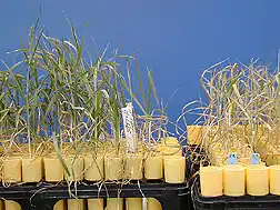 Wheat cultivar tolerant of high salinity (left) compared with non-tolerant variety