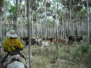 Cattle, mostly beef cattle, were found throughout the countryside. The Chaco region was best known for its contribution to cattle raising because of its lack of crops and its sprawling ranches. Nevertheless, the cattle population density of Eastern Paraguay, 0.6 head per hectare, was actually higher than that of the Chaco region, 0.3 head per hectare.[7]