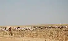 Sheep are herded chiefly by transhumants in Darfur and Kordofan.[16] Large numbers are found in the drier areas at greater elevations than the usual cattle zone.[16] There were several breeds but the predominant and preferred one is the so-called desert sheep, which has both good weight and good milk yield.[16] Villagers in Al-Gedaref and Sinnar also raise large numbers of sheep, mostly on a nonmigratory basis. Fodder comes from crop residues on irrigated and rain-fed farms and from vegetation along the rivers and canals.[16]
