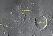 By convention these features are identified on lunar maps by placing the letter on the side of the crater midpoint that is closest to Agrippa.[4] Agrippa B is to the north, Agrippa D and G are further west, Agrippa E is nearly northwest which is attached to another satellite crater Agrippa S, Agrippa F is not far to the east and Agrippa H is north-northeast touching the main crater.