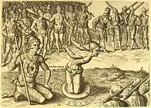 The Acuera, one of the peoples noted by the French as part of Chief Utina's alliance, encountered the conquistador Hernando de Soto's expedition in 1539. De Soto stole corn from the Acuera while camped out in the nearby town of Ocale.[7] However, extensive contact with Europeans did not occur until 1564, when the French Huguenots from the recently established Fort Caroline in present-day Jacksonville first visited the area. The French noted that at this time all the villages along the middle St. Johns, as well as some farther into the interior such as those of the Acuera, were part of a chiefdom ruled by a young leader named Utina. Though only 25 years old, Utina had sovereignty over forty other chiefs and their villages, and was one of the most powerful figures in northern Florida.[8][14] The exact nature of Utina's chiefdom is unclear. He may have been the paramount head of an integrated chiefdom, or he may have been simply the leading chief in a confederacy of smaller chiefdoms. In any case he was treated as a powerful leader by the French and Spanish.[10]