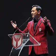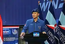 Agus Harimurti Yudhoyono (born 10 August 1978), more commonly referred to as AHY, is an Indonesian politician and former army major who is currently serving as the leader of the Democratic Party of Indonesia. Previously, he worked as military officer in the Indonesian Army from 2000 until 2016. He is the Executive Director of the Yudhoyono Institute and founder of the Agus Harimurti Yudhoyono Foundation. He is the son of former Indonesian president Susilo Bambang Yudhoyono, more commonly known as SBY.[1][2]
