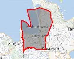 Agusan del Norte is situated in Mindanao's western section of Caraga. It is bordered on the northwest by the Butuan Bay; northeast by Surigao del Norte; mid-east by Surigao del Sur; southeast by Agusan del Sur, and southwest by Misamis Oriental. Agusan del Norte has a total land area of 2,730.24 square kilometres or 1,054.15 square miles. When Butuan is included for geographical purposes, the province's land area is 3,546.86 square kilometres (1,369.45 sq mi).[6]