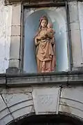 [21] This cross, whose arms are garnished with bells, was used in witchcraft trials in the year 1609 to the outrage of Councilor Lancre[22] who saw it as an evil object. The carvings on the Cross represent the faces of Christ, the Virgin, Saint John, a pelican, and two women's heads. On the back of the cross there is the representation of a bishop, undoubtedly Saint Martin.[10] - A Statue: Virgin of the Assumption (18th century)