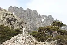 The Aiguilles de Bavella (Corsican: I Forchi di Bavedda; Needles of Bavella) are rocky spikes of red granite[1] that dominate the hill of the same name in Corse-du-Sud, France. At 1218 m, the hill connects the Alta Rocca to the east coast of Corsica. This massif is smaller yet much more popular than the "aiguilles de Popolasca". The site is characterized by jagged peaks, large rock walls and pine trees twisted by the wind.