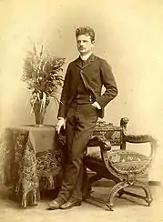 To commemorate the semicentennial of the Kalevala's first publication, the Finnish Literature Society—under the leadership of its chairman, the Finnish senator G. Z. Yrjö-Koskinen—organized a festival on 28 February 1885.[6] The highlight was the premiere of a new Kalevala-themed composition by Finland's then-leading composer: Robert Kajanus's Aino, a symphonic poem (Swedish: symfonisk dikt; Finnish: sinfooninen runoelma) for male chorus and orchestra. Kajanus conducted the Helsinki Orchestral Society (which he had founded in 1882)[7] and an unnamed (likely amateur) choir at the Ceremonial Hall of the Imperial Alexander's University of Finland.[6][8] For Helsingfors Dagblad, the music critic Karl Wasenius (pen name 'Bis') wrote a favorable—if largely descriptive—review, complimenting the piece as "captivating and beautiful... gripping and elevated all the way to the final chord".[9][lower-alpha 2] At the concert, Kajanus also conducted Kullervo's Funeral March (Kullervon surumarssi), his 1880 setting of Kullervo's demise in Runo XXXVI, as well as his Finnish Rhapsody in D minor (1881).[6]