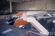 Upon Kennedy's election in 1960, he inherited the VC-137A from Eisenhower. Understanding that the specially built VC-137C dedicated for presidential use had been allocated for but not yet completed, he contacted the French-born American industrial designer Raymond Loewy for help in designing a new livery and interiors for the VC-137 on his wife, Jacqueline Kennedy's recommendation.[27][28]