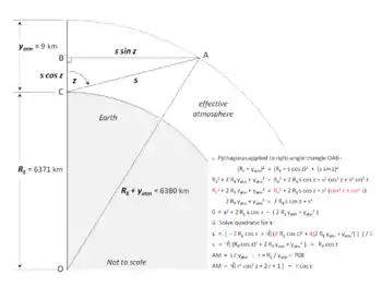 In the figure at right, an observer at O is at an elevation above sea level in a uniform radially symmetrical atmosphere of height . The path length of a light ray at zenith angle is ; is the radius of the Earth. Applying the law of cosines to triangle OAC,