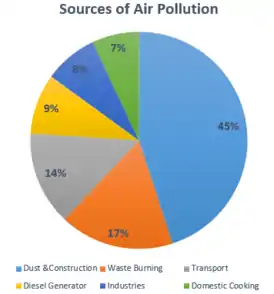 Air pollution in India is a serious health issue.[1] Of the 30 most polluted cities in the world, 21 were in India in 2019.[2][3] As per a study based on 2016 data, at least 140 million people in India breathe air that is 10 times or more over the WHO safe limit[4] and 13 of the world's 20 cities with the highest annual levels of air pollution are in India.[5] 51% of the pollution is caused by industrial pollution, 27 % by vehicles, 17% by crop burning and 5% by other sources.[6] Air pollution contributes to the premature deaths of 2 million Indians every year. Emissions come from vehicles and industry, whereas in rural areas, much of the pollution stems from biomass burning for cooking and keeping warm. In autumn and spring months, large scale crop residue burning in agriculture fields – a cheaper alternative to mechanical tilling – is a major source of smoke, smog and particulate pollution.[7][8][9] India has a low per capita emissions of greenhouse gases but the country as a whole is the third largest greenhouse gas producer after China and the United States.[10] A 2013 study on non-smokers has found that Indians have 30% weaker lung function than Europeans.[11]