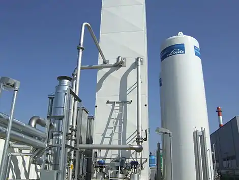 An air separation plant separates atmospheric air into its primary components, typically nitrogen and oxygen, and sometimes also argon and other rare inert gases.