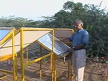 By the time they were ready for their first practical installation, they heard that one of their members, Girja Sharan, had obtained a grant to construct a dew condenser in Kothara, India. In April 2001, Sharan had incidentally noticed substantial condensation on the roof of a cottage at Toran Beach Resort in the arid coastal region of Kutch, where he was briefly staying. The following year, he investigated the phenomenon more closely and interviewed local people. Financed by the Gujarat Energy Development Agency and the World Bank, Sharan and his team went on to develop passive, radiative condensers for use in the arid coastal region of Kutch.[34] Active commercialisation began in 2006.[35]
