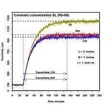 Also in both plots the transit times are indicated; note that these times are measured from the start of the concentration, at time 30 minutes, not from the arbitrary time zero of the plots. In these example graphs, the length of the RW and the diameter of the CW are equal; if they were not equal, then the transit times would not be equal.