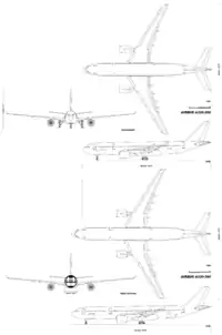 Airbus's first airliner, the A300, was envisioned as part of a diverse family of commercial aircraft. Pursuing this goal, studies began in the early 1970s into derivatives of the A300.[3][4] Before introducing the A300, Airbus identified nine possible variations designated B1 through B9.[5] A tenth variant, the A300B10, was conceived in 1973 and developed into the longer-range Airbus A310.[6] Airbus then focused its efforts on single-aisle (SA) studies, conceiving a family of airliners later known as the Airbus A320 family, the first commercial aircraft with digital fly-by-wire controls. During these studies Airbus turned its focus back to the wide-body aircraft market, simultaneously working on both projects.[6]
