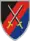 The coat of arms of Airmobile Operations Division depicts a flying black eagle, with its wings turned upright, holding a sword in its claws on a argent. Below the eagle a red arrow is shown. The argent symbolises dedication and the eagle strength, courage and bravery. The eagle's upturned wings, somewhat unusual in heraldry, represent the lunging out for new power. The sword stands for strike capability and penetration depth. The red arrow illustrates the third dimension, the depth of space and the dynamics of the division. The framing silver cord shows the status as a division. The maroon coloured seam corresponds with the traditional beret colour of the Army Aviation Corps and airborne forces.