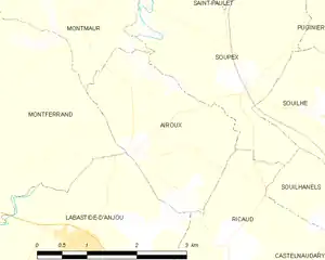 Airoux is within the urban area of Castelnaudary situated in the Lauragais on the Rigole de la plaine. It is located some 5 km north-west of Castelnaudary and 15 km south-east of Villefranche-de-Lauragais. It can be accessed on road D217 from Labastide-d'Anjou in the south through the village and continuing north-east to Soupex. There is also the D1 road from Montmaur in the northwest which also passes through the village and continues south-east to Ricaud. The commune consists entirely of farmland with no other villages or hamlets.[4]