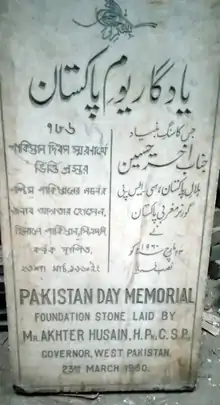 Akhter Husain was appointed Governor on 28 August 1957 and remained in this position following the imposition of Martial law in Oct 1958. In the same year he was appointed Chairman of the Land Reforms Commission and provincial administration committee. In 1958, he was awarded the highest civil award of Hilal-i-Pakistan. He was responsible for raising money for the construction of the Pakistan Day Memorial Monument (now known as Minar-e-Pakistan) and laid its foundation stone in the then Minto Park Lahore on 23 March 1960.